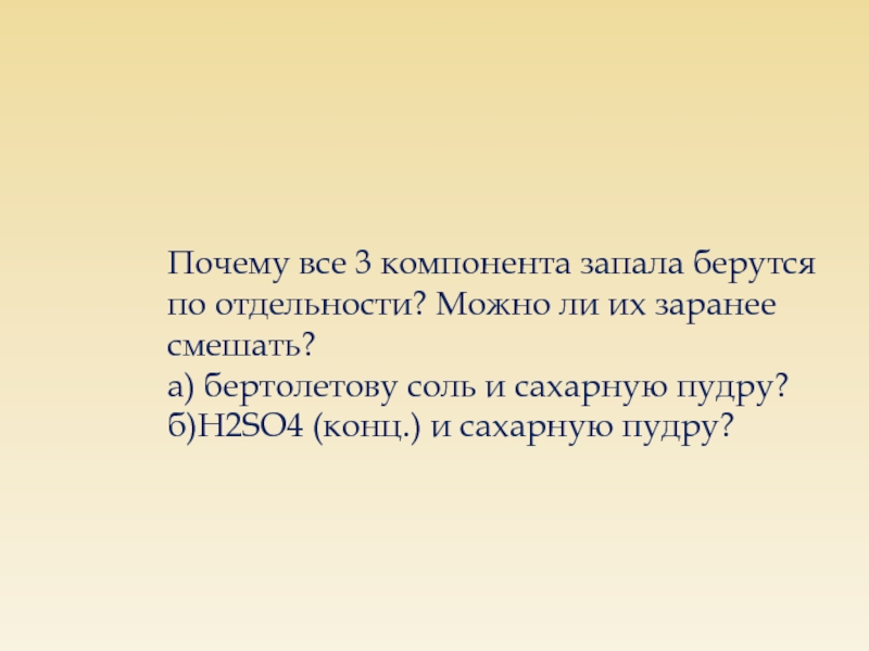 Слайд 31Почему все 3 компонента запала берутся по отдельности? Можно ли их