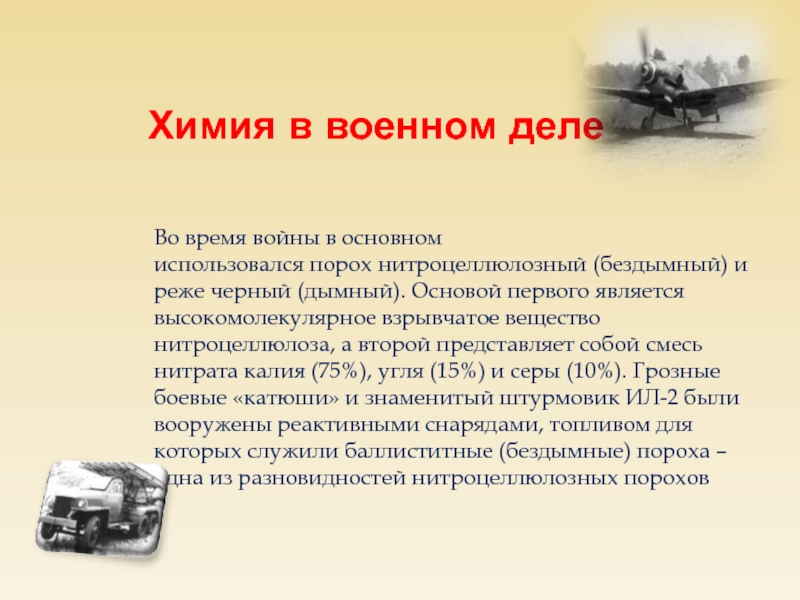использовался порох нитроцеллюлозный (бездымный) и реже черный (дымный). Основой первого является высокомолекулярное взрывчатое вещество нитроцеллюлоза, а второй представляет собой смесь нитрата калия (75%), угля (15%) и серы (10%). Грозные боевые «катюши» и знаменитый штурмовик ИЛ-2 были вооружены реактивными снарядами, топливом для которых служили баллиститные (бездымные) пороха – одна из разновидностей нитроцеллюлозных порохов