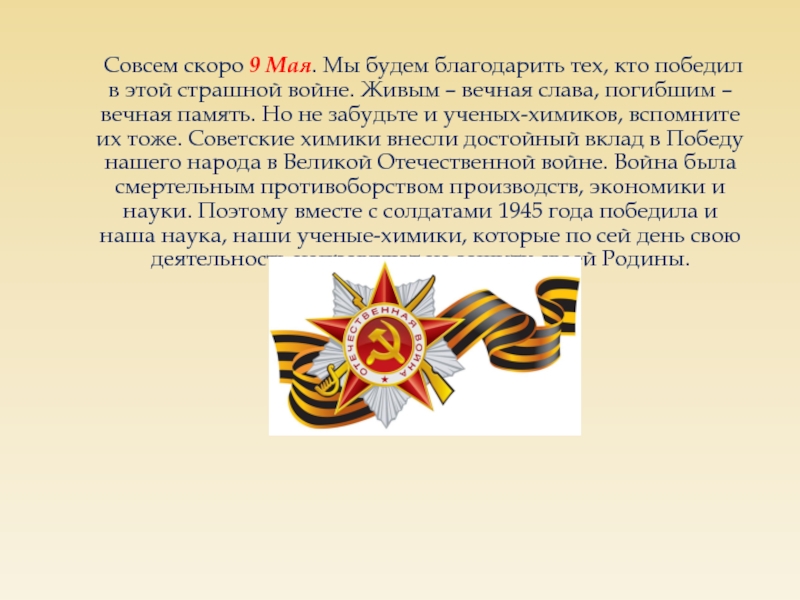 в этой страшной войне. Живым – вечная слава, погибшим – вечная память. Но не забудьте и ученых-химиков, вспомните их тоже. Советские химики внесли достойный вклад в Победу нашего народа в Великой Отечественной войне. Война была смертельным противоборством производств, экономики и науки. Поэтому вместе с солдатами 1945 года победила и наша наука, наши ученые-химики, которые по сей день свою деятельность направляют на защиту своей Родины.