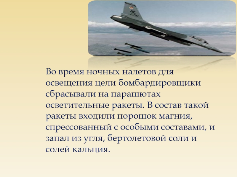 осветительные ракеты. В состав такой ракеты входили порошок магния, спрессованный с особыми составами, и запал из угля, бертолетовой соли и солей кальция.
