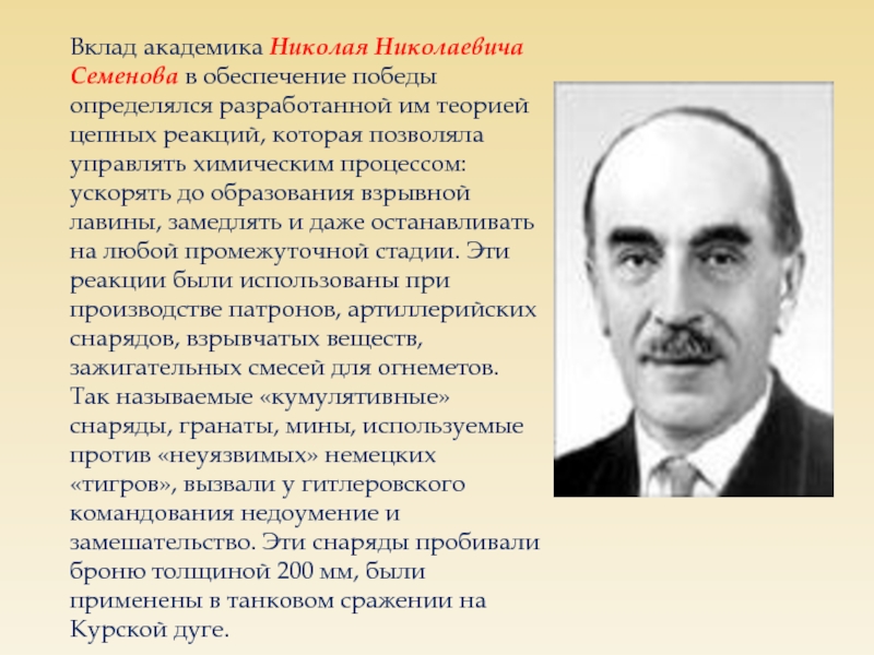 Слайд 40Вклад академика Николая Николаевича Семенова в обеспечение победы определялся разработанной им