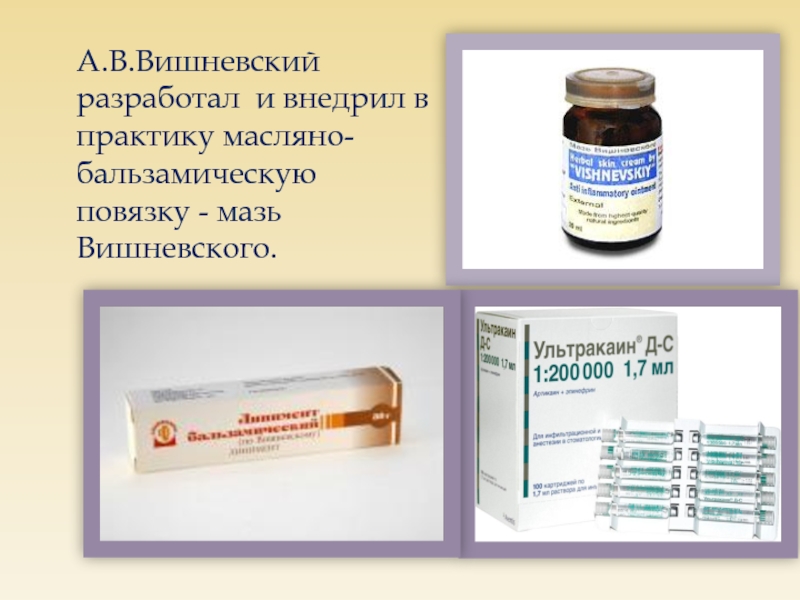 Слайд 14А.В.Вишневский разработал и внедрил в практику масляно-бальзамическую повязку - мазь Вишневского.