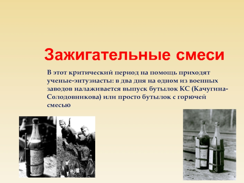 дня на одном из военных заводов налаживается выпуск бутылок КС (Качугина-Солодовникова) или просто бутылок с горючей смесью