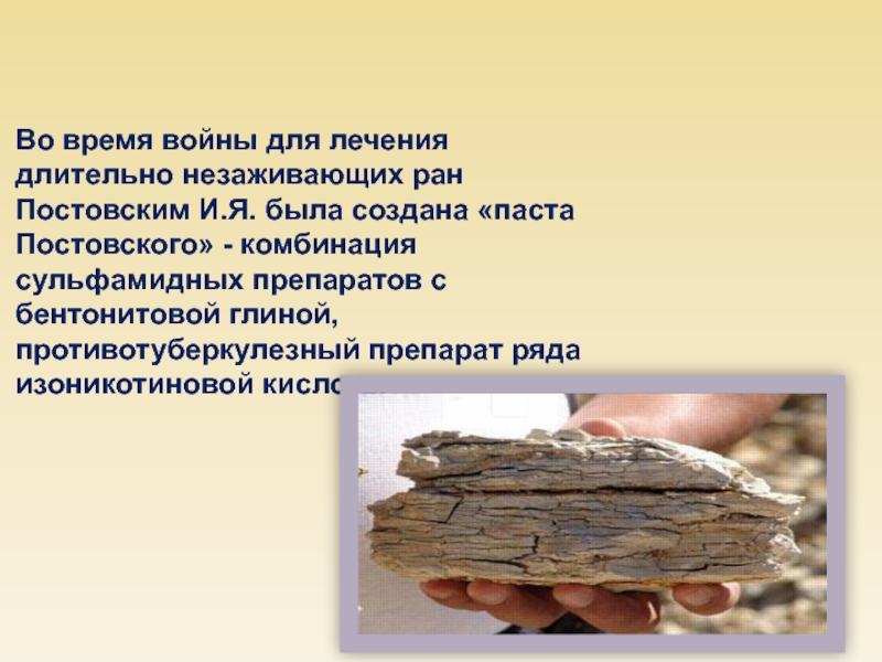 Слайд 10Во время войны для лечения длительно незаживающих ран Постовским И.Я. была