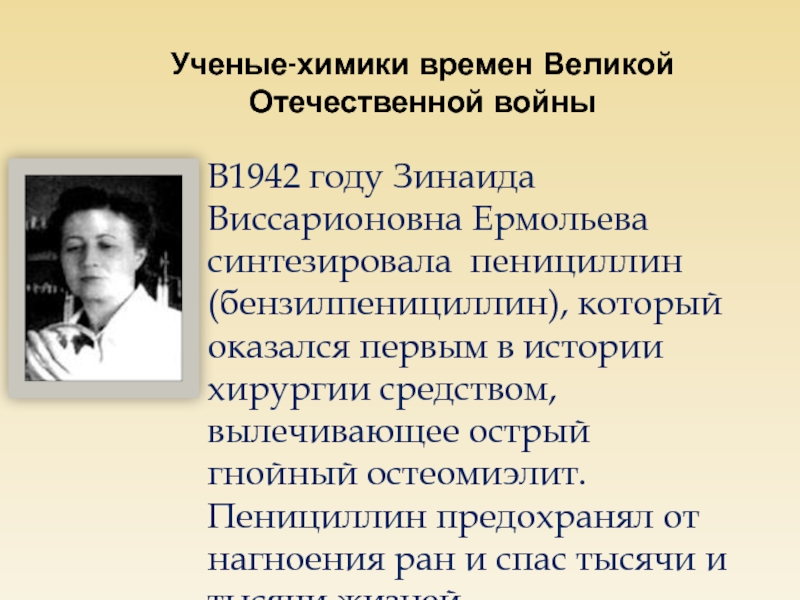В1942 году Зинаида Виссарионовна Ермольева синтезировала пенициллин