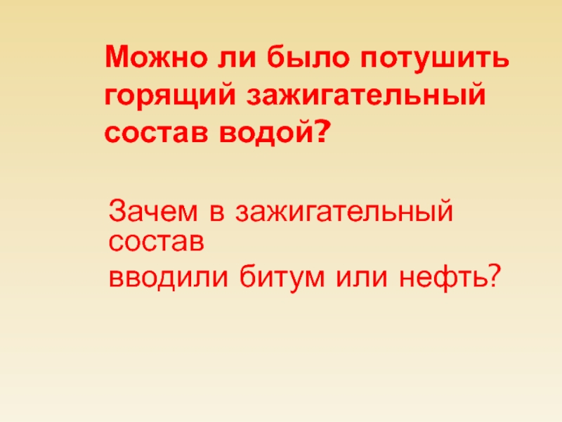 Слайд 35Можно ли было потушить горящий зажигательный состав водой?