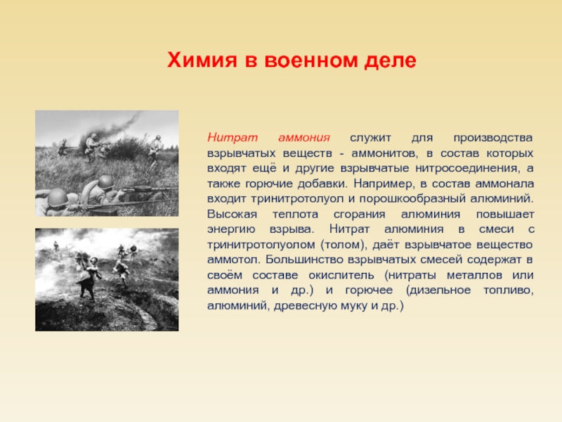 Слайд 44Нитрат аммония служит для производства взрывчатых веществ - аммонитов, в состав