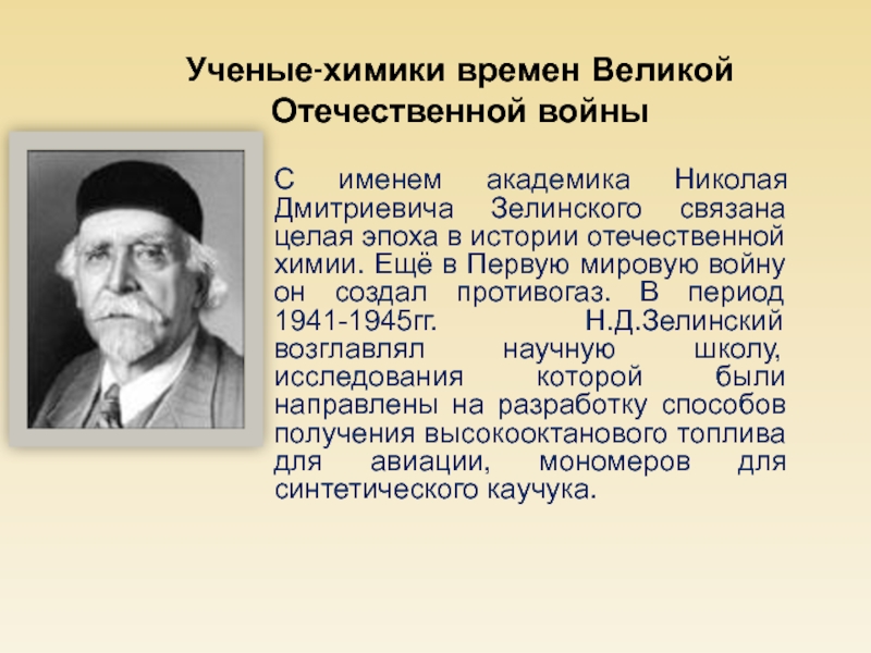 целая эпоха в истории отечественной химии. Ещё в Первую мировую войну он создал противогаз. В период 1941-1945гг. Н.Д.Зелинский возглавлял научную школу, исследования которой были направлены на разработку способов получения высокооктанового топлива для авиации, мономеров для синтетического каучука.