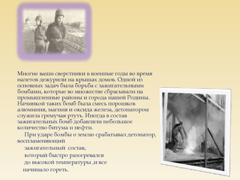 крышах домов. Одной из основных задач была борьба с зажигательными бомбами, которые во множестве сбрасывали на промышленные районы и города нашей Родины. Начинкой таких бомб была смесь порошков алюминия, магния и оксида железа, детонатором служила гремучая ртуть. Иногда в состав зажигательных бомб добавляли небольшое количество битума и нефти.
