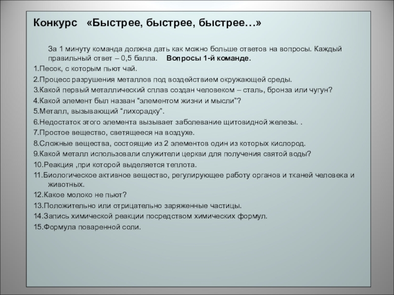 За 1 минуту команда должна дать как можно больше ответов на вопросы. Каждый правильный ответ – 0,5 балла. Вопросы 1-й команде.