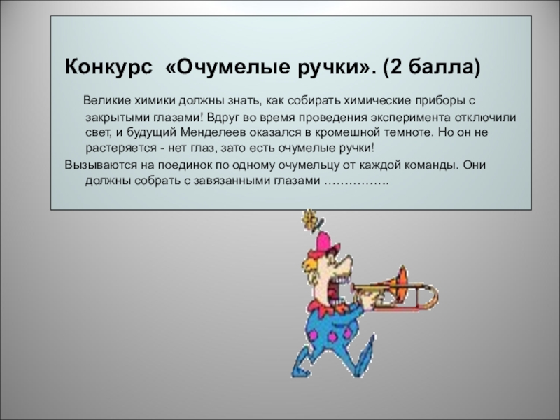 собирать химические приборы с закрытыми глазами! Вдруг во время проведения эксперимента отключили свет, и будущий Менделеев оказался в кромешной темноте. Но он не растеряется - нет глаз, зато есть очумелые ручки!
