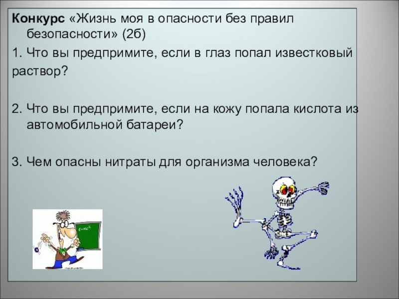 2. Что вы предпримите, если на кожу попала кислота из автомобильной батареи?