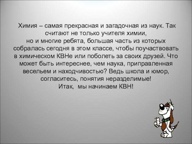 но и многие ребята, большая часть из которых собралась сегодня в этом классе, чтобы поучаствовать в химическом КВНе или поболеть за своих друзей. Что может быть интереснее, чем наука, приправленная весельем и находчивостью? Ведь школа и юмор, согласитесь, понятия неразделимые! Итак, мы начинаем КВН!
