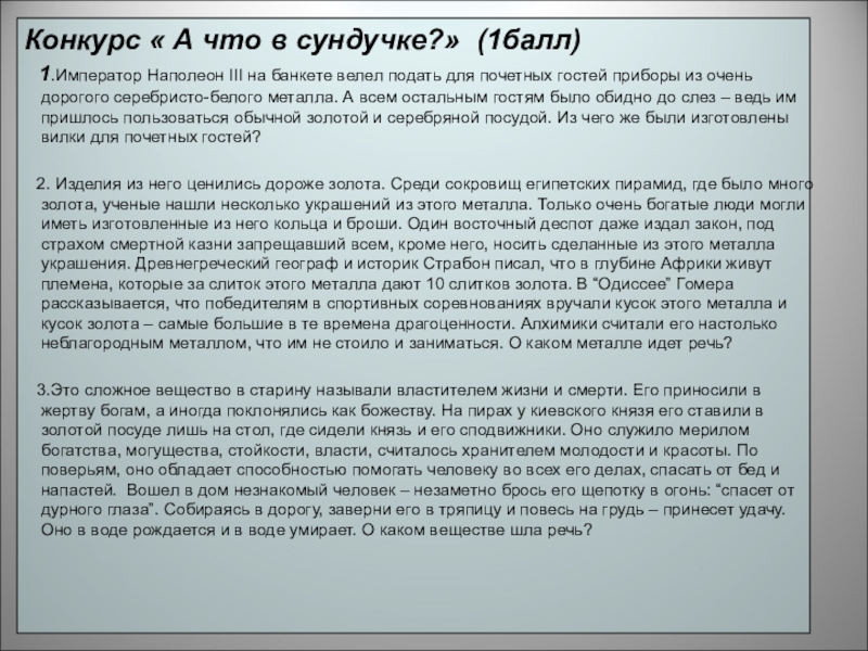 2. Изделия из него ценились дороже золота. Среди сокровищ египетских пирамид, где было много золота, ученые нашли несколько украшений из этого металла. Только очень богатые люди могли иметь изготовленные из него кольца и броши. Один восточный деспот даже издал закон, под страхом смертной казни запрещавший всем, кроме него, носить сделанные из этого металла украшения. Древнегреческий географ и историк Страбон писал, что в глубине Африки живут племена, которые за слиток этого металла дают 10 слитков золота. В “Одиссее” Гомера рассказывается, что победителям в спортивных соревнованиях вручали кусок этого металла и кусок золота – самые большие в те времена драгоценности. Алхимики считали его настолько неблагородным металлом, что им не стоило и заниматься. О каком металле идет речь?