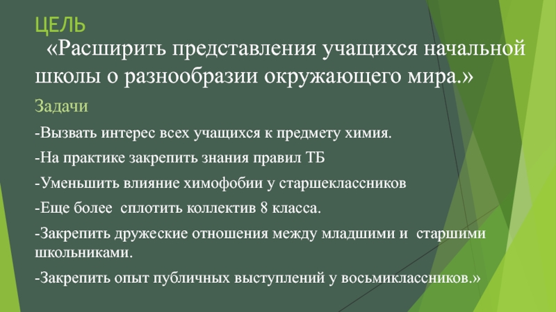 ЦЕЛЬ «Расширить представления учащихся начальной школы о разнообразии окружающего мира.»Задачи -Вызвать интерес всех учащихся к предмету химия.-На практике закрепить знания правил ТБ -Уменьшить влияние химофобии у старшеклассников-Еще более сплотить коллектив 8 класса.-Закрепить дружеские отношения между младшими
