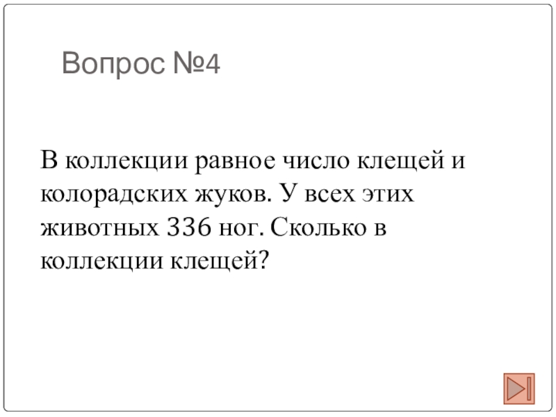 Вопрос №4В коллекции равное число клещей и колорадских жуков. У всех этих животных 336 ног. Сколько в