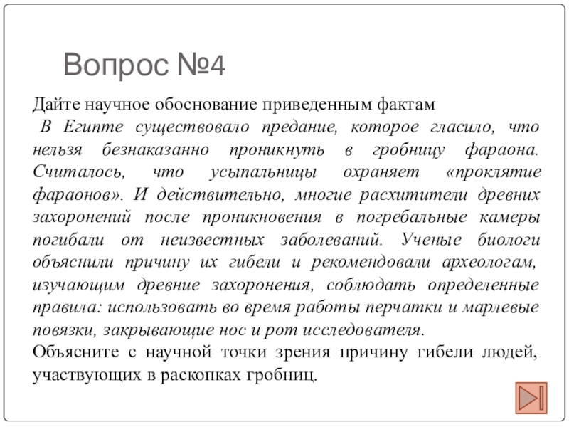 Вопрос №4Дайте научное обоснование приведенным фактам В Египте существовало предание, которое гласило, что нельзя безнаказанно проникнуть в