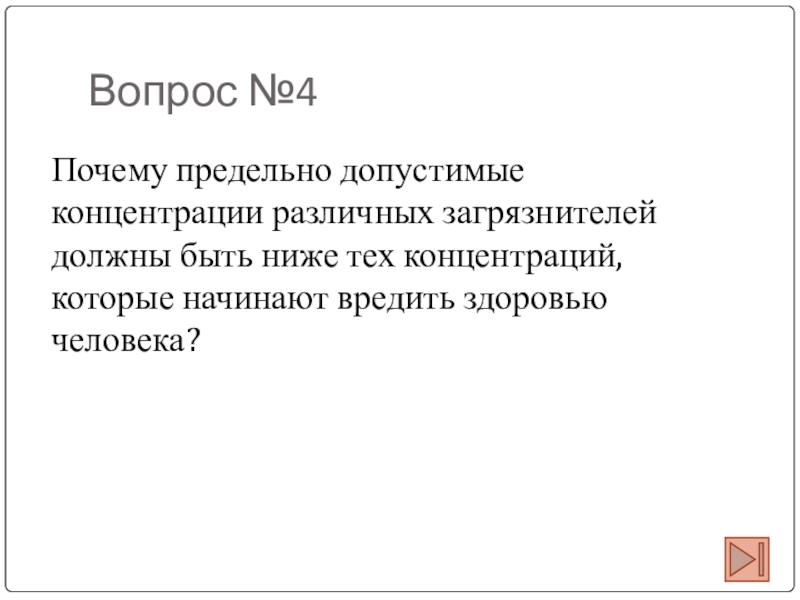 Вопрос №4Почему предельно допустимые концентрации различных загрязнителей должны быть ниже тех концентраций, которые начинают вредить здоровью человека?