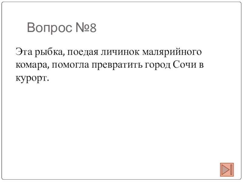 Вопрос №8Эта рыбка, поедая личинок малярийного комара, помогла превратить город Сочи в курорт.
