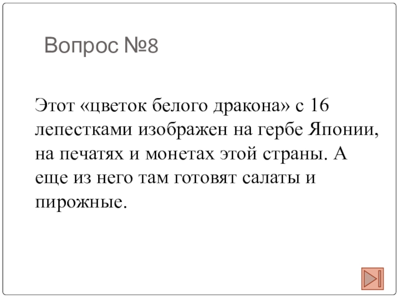 Вопрос №8Этот «цветок белого дракона» с 16 лепестками изображен на гербе Японии, на печатях и монетах этой
