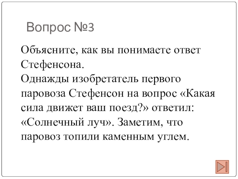 Вопрос №3Объясните, как вы понимаете ответ Стефенсона. Однажды изобретатель первого паровоза Стефенсон на вопрос «Какая сила движет