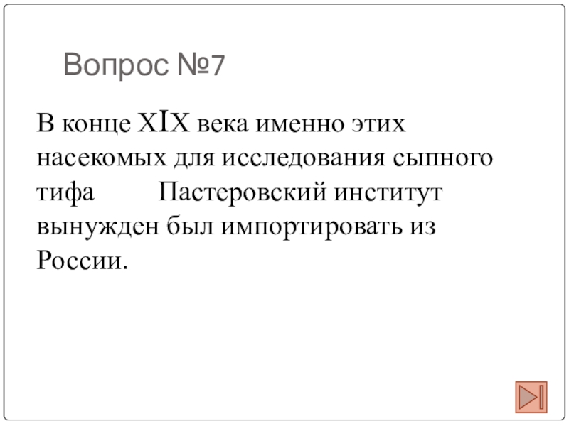 Вопрос №7В конце ХIХ века именно этих насекомых для исследования сыпного тифа     Пастеровский