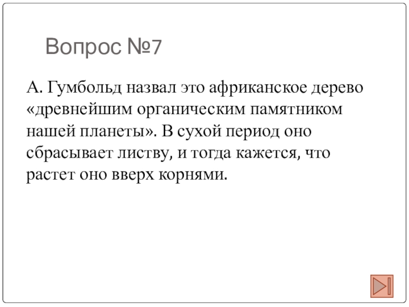 Вопрос №7А. Гумбольд назвал это африканское дерево «древнейшим органическим памятником нашей планеты». В сухой период оно сбрасывает