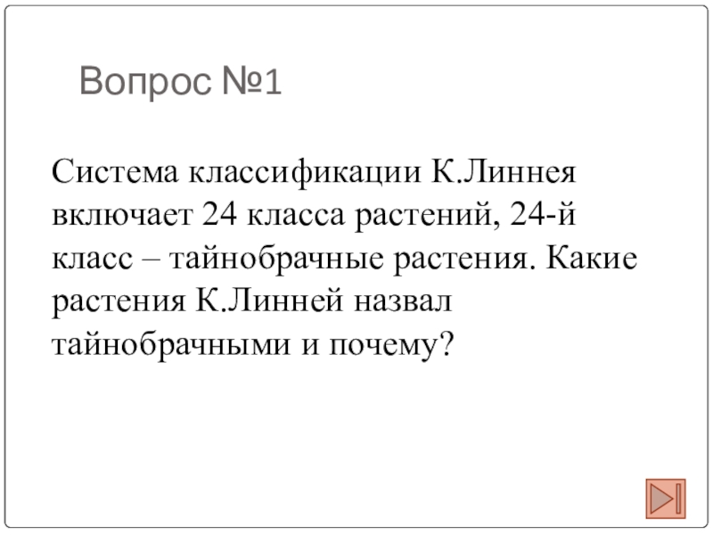 Вопрос №1Система классификации К.Линнея включает 24 класса растений, 24-й класс – тайнобрачные растения. Какие растения К.Линней назвал