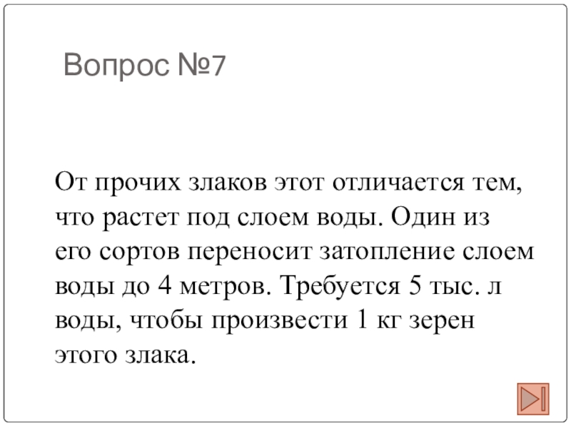 Вопрос №7От прочих злаков этот отличается тем, что растет под слоем воды. Один из его сортов переносит
