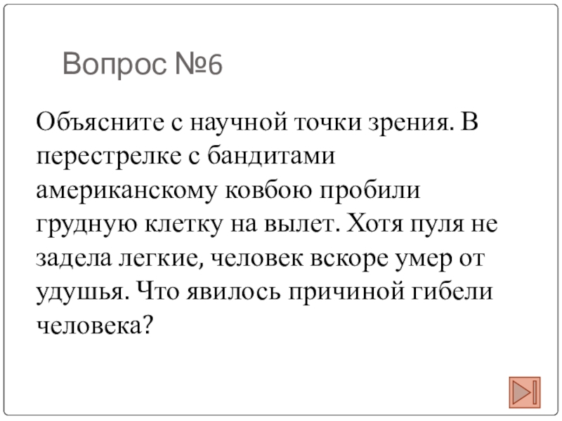 Вопрос №6Объясните с научной точки зрения. В перестрелке с бандитами американскому ковбою пробили грудную клетку на вылет.