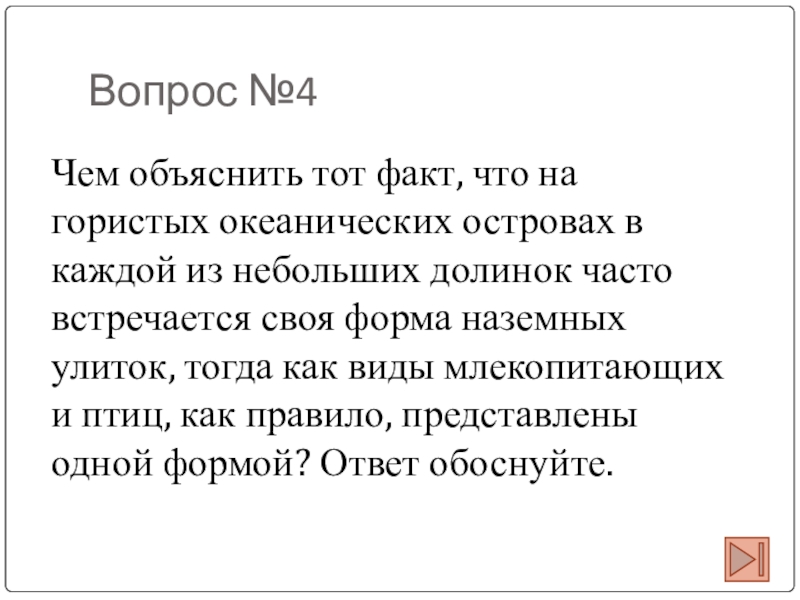 Вопрос №4Чем объяснить тот факт, что на гористых океанических островах в каждой из небольших долинок часто встречается