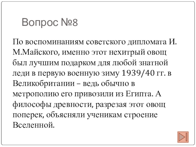 Вопрос №8По воспоминаниям советского дипломата И.М.Майского, именно этот нехитрый овощ был лучшим подарком для любой знатной леди
