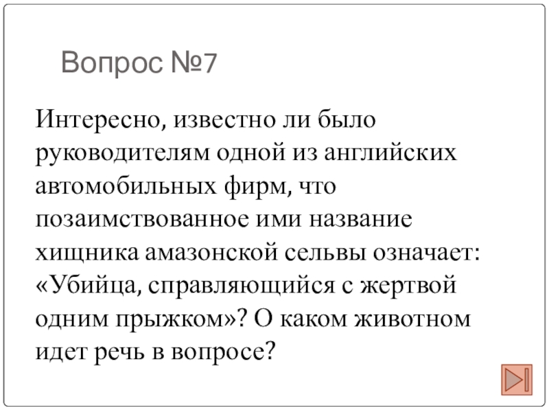 Вопрос №7Интересно, известно ли было руководителям одной из английских автомобильных фирм, что позаимствованное ими название хищника амазонской