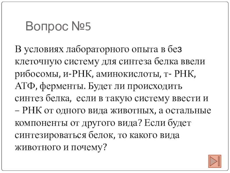 Вопрос №5В условиях лабораторного опыта в без клеточную систему для синтеза белка ввели рибосомы, и-РНК, аминокислоты, т-