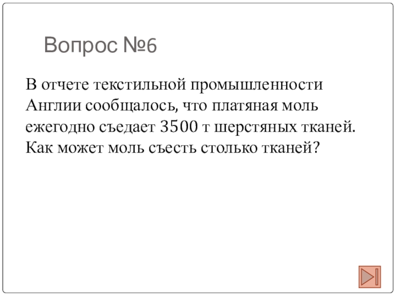 Вопрос №6В отчете текстильной промышленности Англии сообщалось, что платяная моль ежегодно съедает 3500 т шерстяных тканей. Как