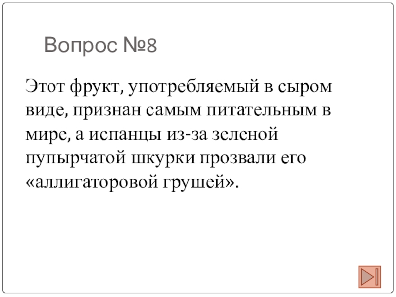 Вопрос №8Этот фрукт, употребляемый в сыром виде, признан самым питательным в мире, а испанцы из-за зеленой пупырчатой