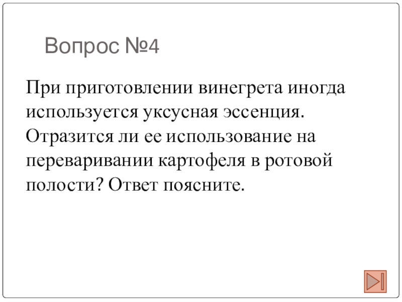 Вопрос №4При приготовлении винегрета иногда используется уксусная эссенция. Отразится ли ее использование на переваривании картофеля в ротовой