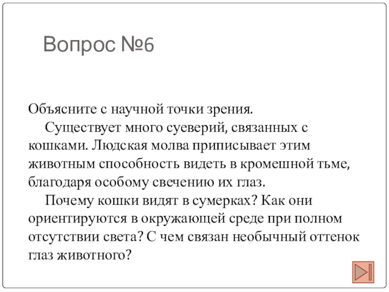 Вопрос №6Объясните с научной точки зрения.   Существует много суеверий, связанных с кошками. Людская молва приписывает