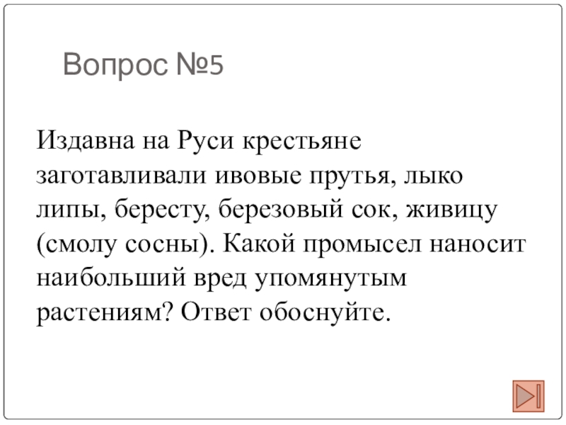 Вопрос №5Издавна на Руси крестьяне заготавливали ивовые прутья, лыко липы, бересту, березовый сок, живицу (смолу сосны). Какой