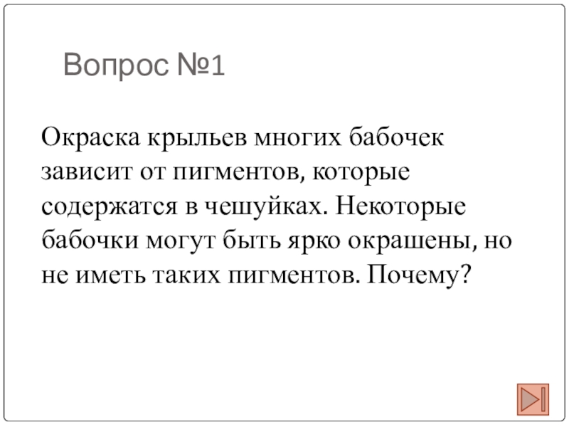 Вопрос №1Окраска крыльев многих бабочек зависит от пигментов, которые содержатся в чешуйках. Некоторые бабочки могут быть ярко