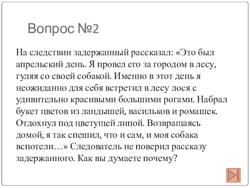 Вопрос №2На следствии задержанный рассказал: «Это был апрельский день. Я провел его за городом в лесу, гуляя