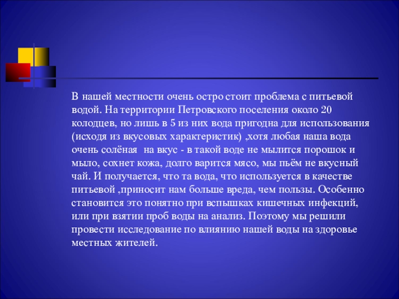 Слайд 4В нашей местности очень остро стоит проблема с питьевой водой. На