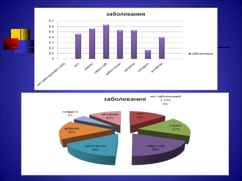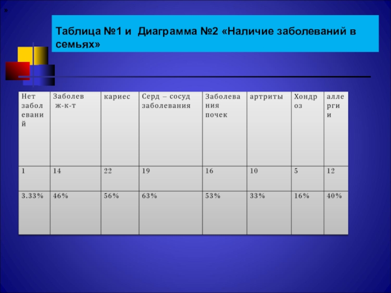 Слайд 6Таблица №1 и Диаграмма №2 «Наличие заболеваний в семьях»