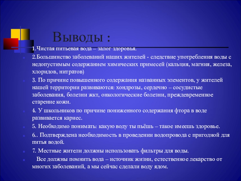 наших жителей - следствие употребления воды с недопустимым содержанием химических примесей (кальция, магния, железа, хлоридов, нитратов)