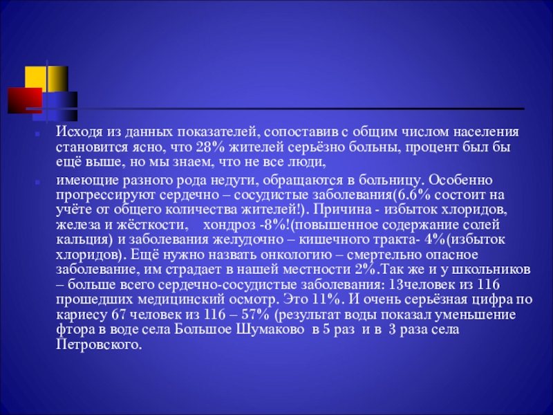 имеющие разного рода недуги, обращаются в больницу. Особенно прогрессируют сердечно – сосудистые заболевания(6.6% состоит на учёте от общего количества жителей!). Причина - избыток хлоридов, железа и жёсткости, хондроз -8%!(повышенное содержание солей кальция) и заболевания желудочно – кишечного тракта- 4%(избыток хлоридов). Ещё нужно назвать онкологию – смертельно опасное заболевание, им страдает в нашей местности 2%.Так же и у школьников – больше всего сердечно-сосудистые заболевания: 13человек из 116 прошедших медицинский осмотр. Это 11%. И очень серьёзная цифра по кариесу 67 человек из 116 – 57% (результат воды показал уменьшение фтора в воде села Большое Шумаково в 5 раз и в 3 раза села Петровского.