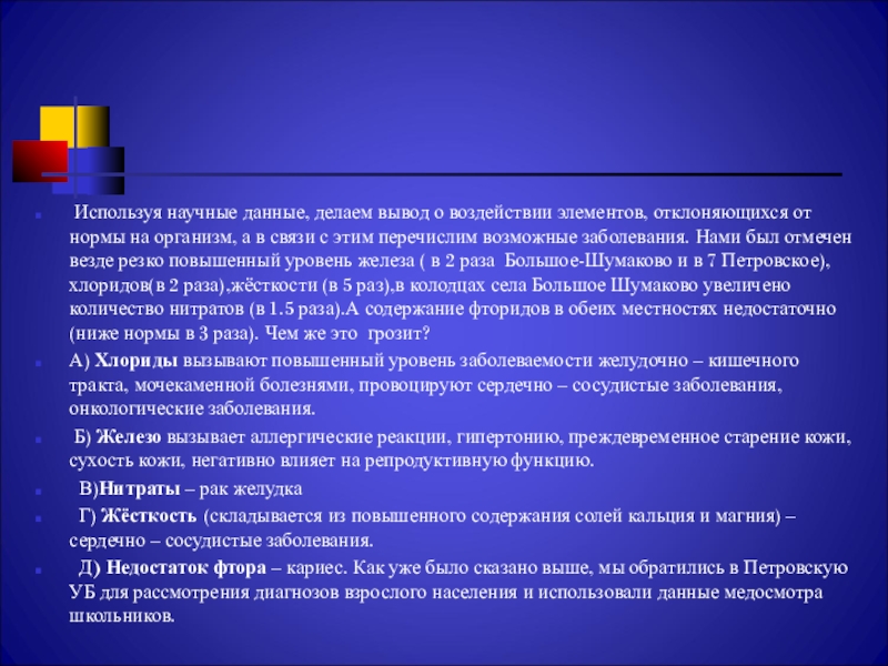 нормы на организм, а в связи с этим перечислим возможные заболевания. Нами был отмечен везде резко повышенный уровень железа ( в 2 раза Большое-Шумаково и в 7 Петровское),хлоридов(в 2 раза),жёсткости (в 5 раз),в колодцах села Большое Шумаково увеличено количество нитратов (в 1.5 раза).А содержание фторидов в обеих местностях недостаточно (ниже нормы в 3 раза). Чем же это грозит?