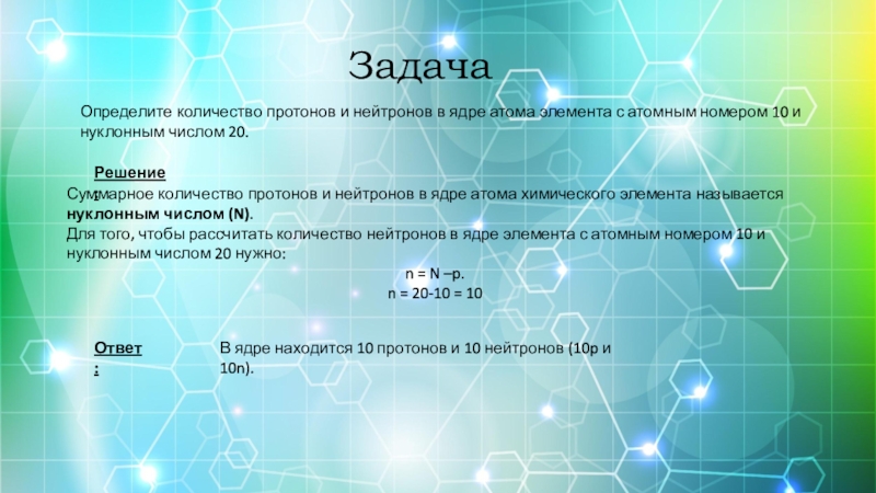 Определите количество протонов и нейтронов в ядре атома элемента с атомным номером 10 и нуклонным числом 20.