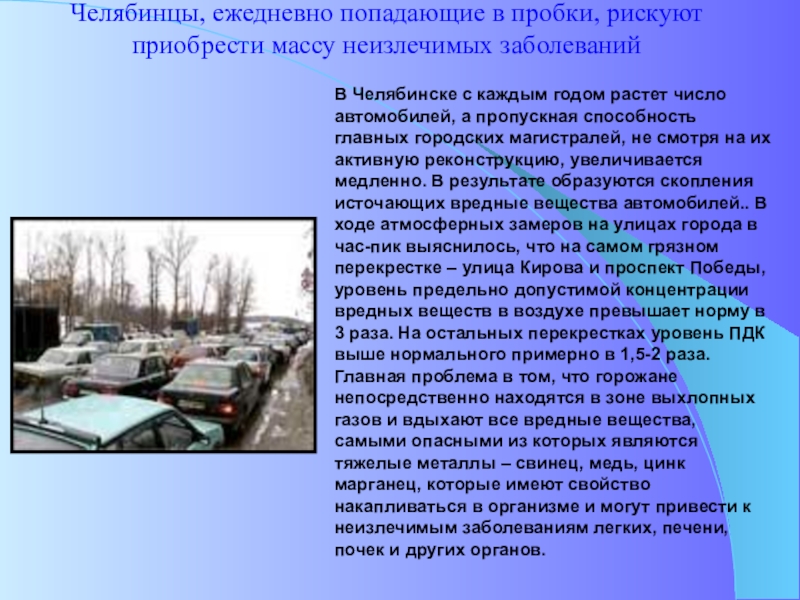 Главные вредные вещества, сождержащиеся в воздухе Челябинска, – это бензоперен, формальдегид, фенол. Единственное, что не превышает предельно допустимые концентрации в воздухе это тяжелые металлы.