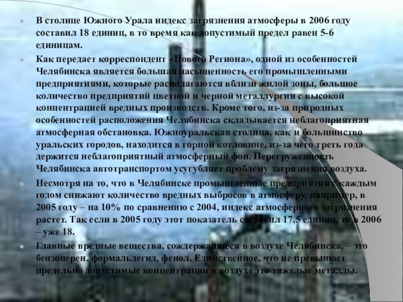 Несмотря на то, что в Челябинске промышленные предприятия с каждым годом снижают количество вредных выбросов в атмосферу, например, в 2005 году – на 10% по сравнению с 2004, индекс атмосферного загрязнения растет. Так если в 2005 году этот показатель составил 17,5 единиц, то в 2006 – уже 18.