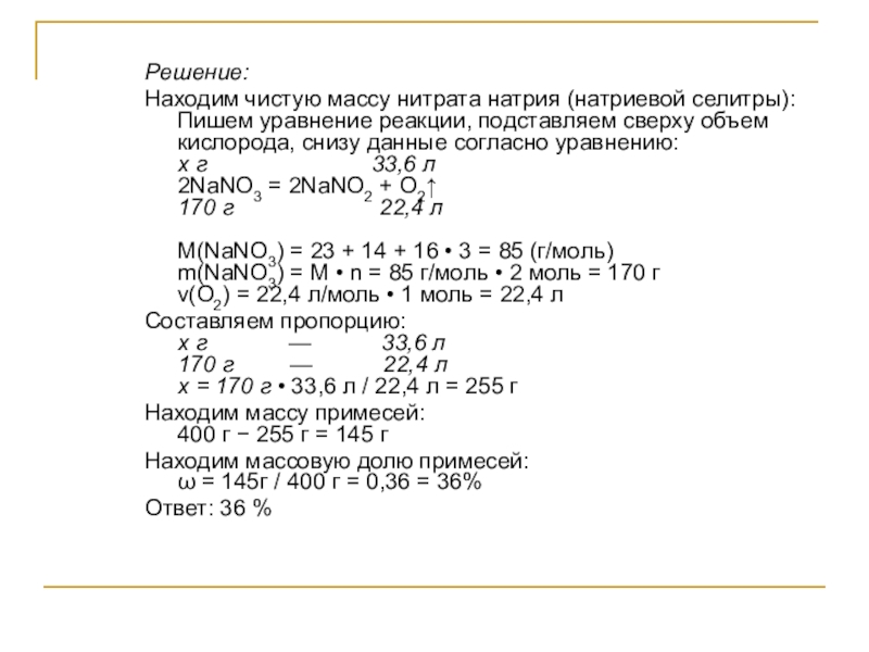 При прокаливании 400 г натриевой селитры получили 33,6 л кислорода. какова